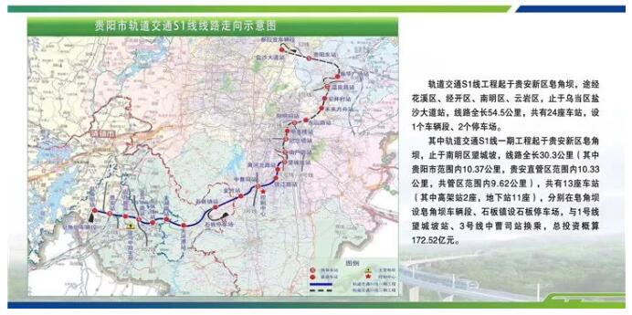 據了解,貴陽市軌道交通S1線一期工程項目全長30.32公里,總投資172.52億元。起自貴安新區皂角壩站、終至貴陽市望城坡站,其中地下線22.64公里,高架及過渡段長7.68公里;共設車站13座(其中地下車站11座、高架車站2座),含4座換乘車站;設皂角壩車輛段和石板停車場;在金馬中路站及中曹司站附近設主變電站2座(中曹司站附近的主變電所與3號線共享);初期配車20列/120輛;最高運行速度100公里/小時。