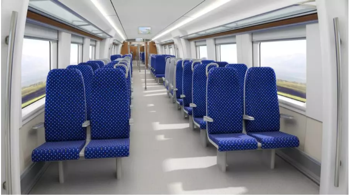 車廂內部為2+2軟包座椅,海藍色凸顯了地區特色,立桿、扶手簡潔明快。