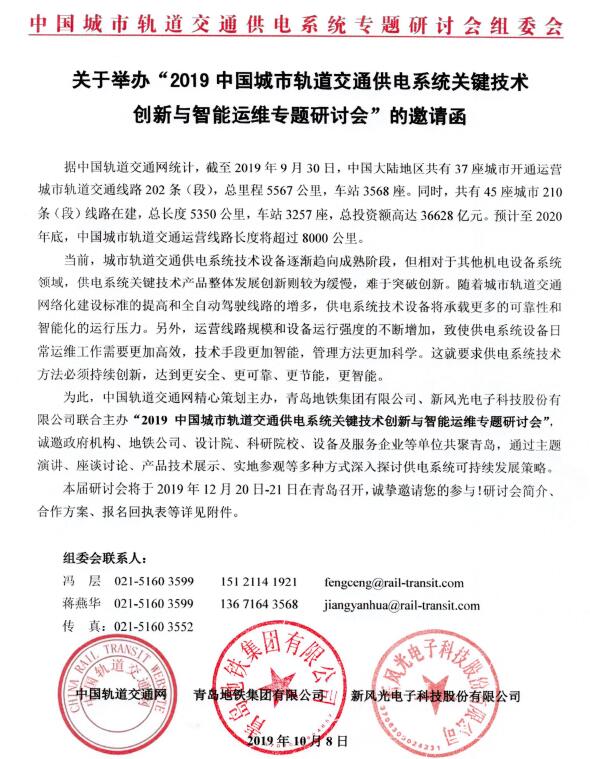 2019年12月20日-21日,由軌道交通網(wǎng)精心策劃主辦,青島地鐵集團(tuán)有限公司、新風(fēng)光電子科技股份有限公司聯(lián)合主辦“2019城市軌道交通供電系統(tǒng)關(guān)鍵技術(shù)創(chuàng)新與智能運(yùn)維專題研討會",將在青島召開。屆時,政府機(jī)構(gòu)、地鐵公司、設(shè)計院、科研院校、設(shè)備及服務(wù)企業(yè)等單位共聚青島,通過主題演講、座談討論、產(chǎn)品技術(shù)展示、實地參觀等多種方式深入探討供電系統(tǒng)可持續(xù)發(fā)展策略。