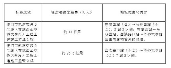 項目共劃分為兩個標段進行招標,分別是廈門市軌道交通6號線(林埭西至華僑大學段)工程土建施工監理1標和土建施工監理2標,兩個標段的具體招標范圍及內容如下: